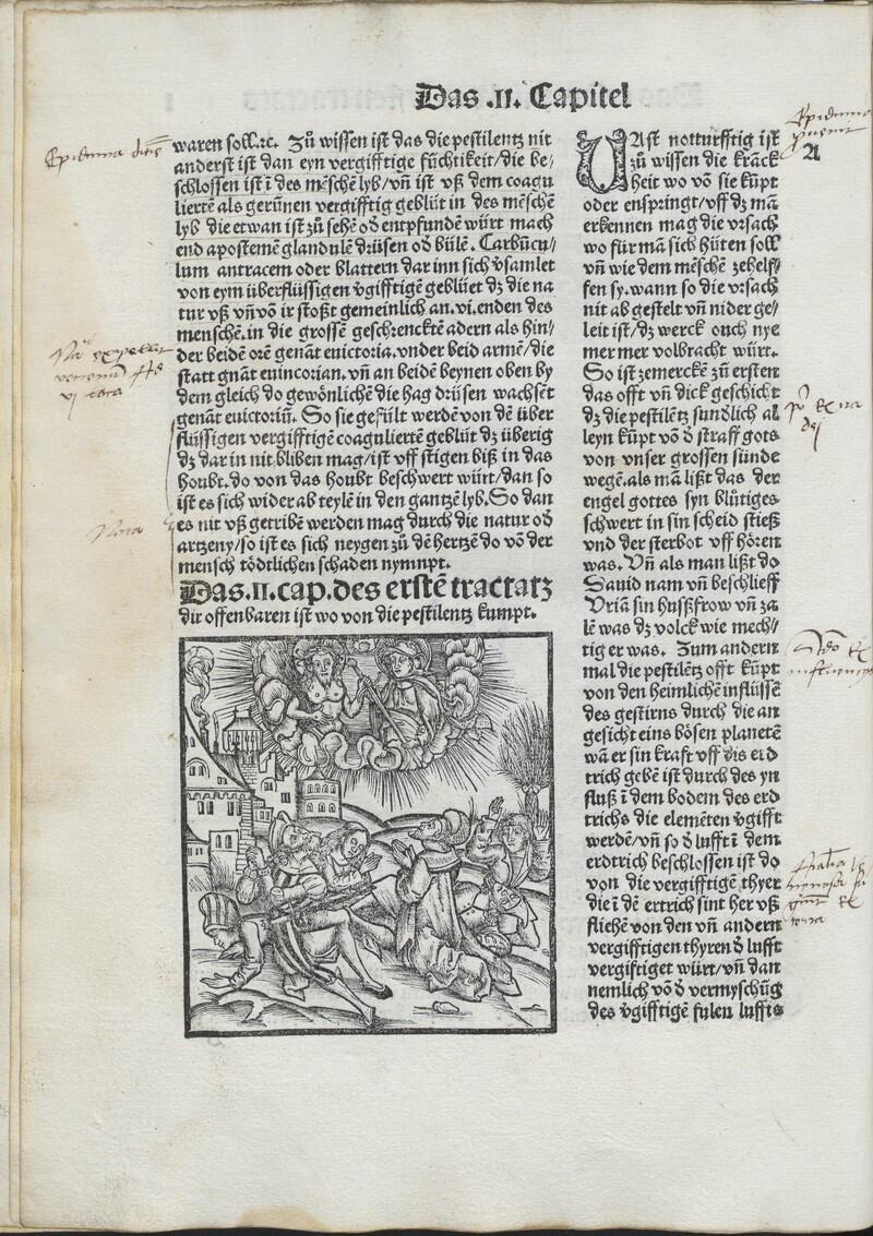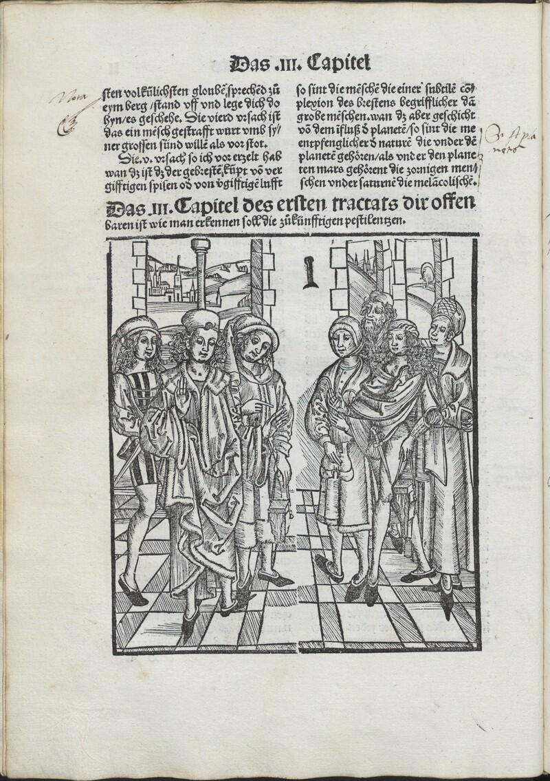 To know the disease, it is very necessary to know from whence it comes or arises, so that one can recognize the cause from which one should protect oneself and how a person can be helped. Thus if the cause is not cut off or quashed, the work will also never be completed. First it should be noted that it often happens that pestilence comes solely and especially from God’s punishment for our great sins, just as one reads that David took and slept with Uriah’s housewife and counted how many people were in his legions. Secondly the pestilence often comes from the secret influence of the stars through the face of an evil planet. When it exerts its power on the earth, the element is poisoned through the influx in the earth’s ground, and thus air is trapped in the ground, from which subterraneous poisonous animals flee. From them and other poisonous animals, the air is poisoned, and then the mixture of foul, poisonous air and the moisture of the earth saturates the soil where herbs and fruit grow, from which the people and animals who eat it are poisoned, from which that water that flows through the earth is poisoned, which poisons the people and animals who drink it. I recommend that you recognize and reveal this influence of the stars, the astronomis . Third, if a person eats too much fruit or unripe food and gets too full of food and drink, as commonly happens after a drought, when people eat all food good and bad—if then the stomach cannot digest such food, it will be full in the person’s body and become poison, which causes illness. The same things happens if a person inhales poisonous air into his lungs with his breath, which happens sometimes with large effect if dead bodies are left lying on the ground, from which the air is poisoned. It also comes from other visible things, as Hippocrates says, of quick and great reversal of the seasons, such as when the summer is too cold and moist and the winter much too warm, the same if spring and autumn do not have their natural potency…