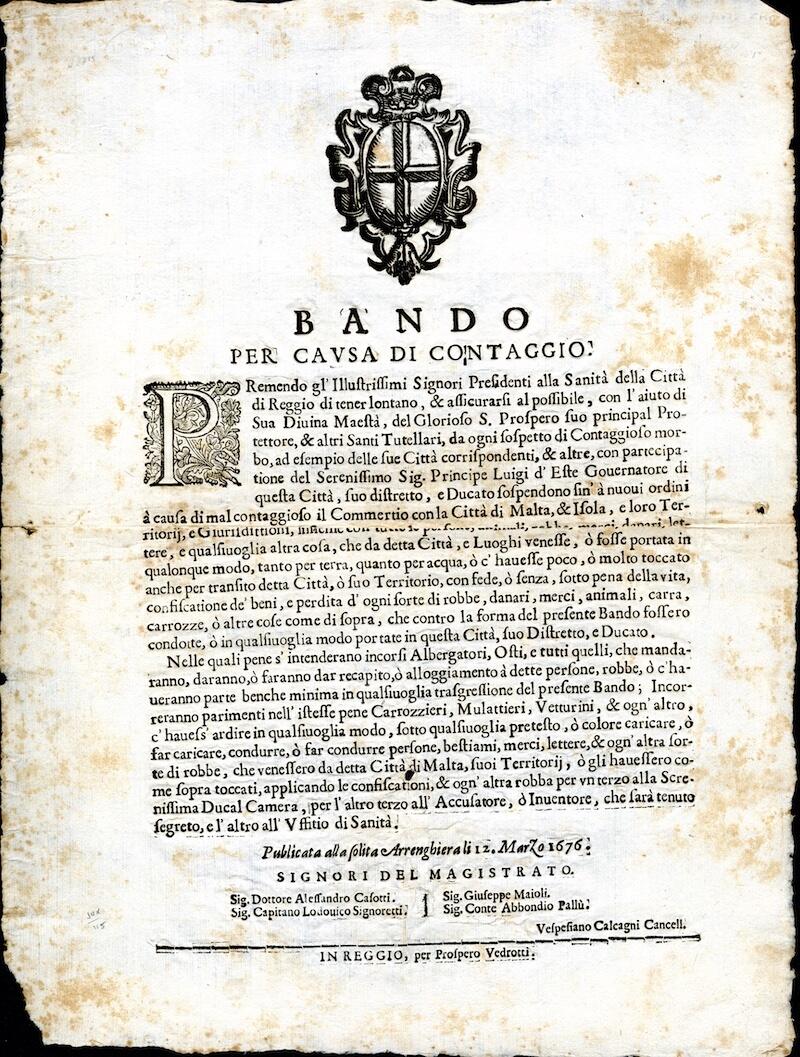 The most illustrious men, presidents of the health board of the city of Reggio, [1] with the help of His Divine Majesty, the glorious San Prospero its most important protector, and other guardian saints, strive to keep [the city] distant and secure it as much as possible from any suspect of contagious disease. In light of the example given by nearby cities, and by others [more distant], and with the participation of the most Serene Prince Luigi d’Este, governor of this city, its district, and duchy, [the health board’s magistrates] suspend, until further notice, on account of a contagious disease, the commerce with the city and the island of Malta and their territories and jurisdictions, together with all of the people, animals, belongings, merchandise, money, and letters, as well as any other thing coming from that city and regions or brought in any way, through land as through sea, or that had been involved, to any extent, in transit through that city or its territory, with fede or without. [2] [Offenders are] under the penalty of capital punishment, confiscation of goods, or the loss of any sort of property, money, merchandise, animals, carts, carriages, or other things as mentioned above, which, against the lines of this Ban, might be driven or brought in any way to this city, its district, and its duchy.